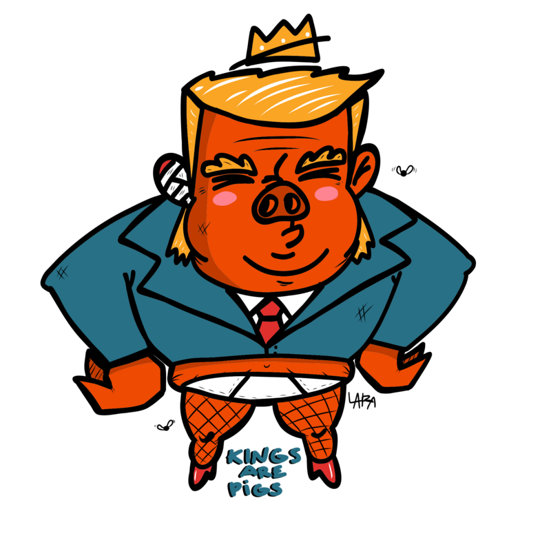 This is a zoomorph image depicting the curent USA leader. It conveys that this president acts like an animal/pig towards humanity. He acts like a king and the USA is in no need for a king that abuses his power.