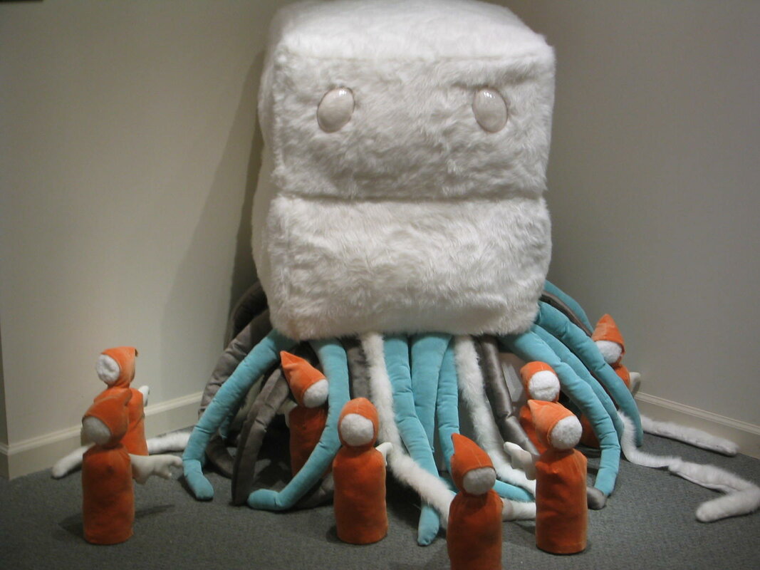 Art exhibit. There is a character that lives inside the mouth. Made of foam, fur and velvet