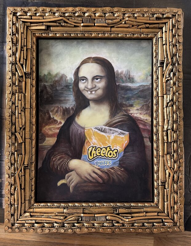 a hazy, tongue-in-cheek tribute to the world’s most scrutinized smile. Painted faithfully in oil in a dazed, dreamlike state—part homage, part high. The replica ornate frame, lovingly reconstructed from salvaged street debris and encased, pokes fun at the divide between high art and low culture.