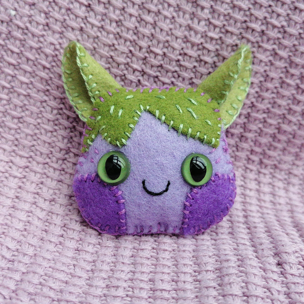 Beatrice started as an eggplant and ended up... somewhere else. She's a felt pin made of wool felt and cotton thread.
