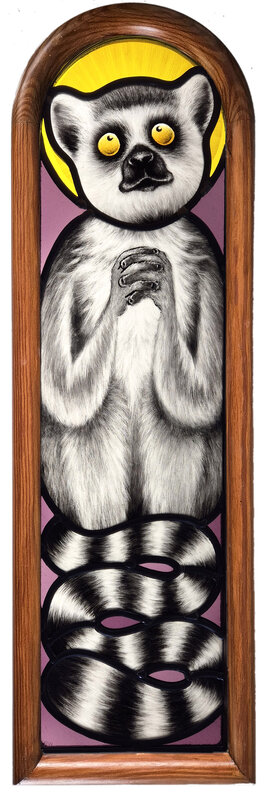 handpainted and kilnfired stained glass lemur in wooden frame