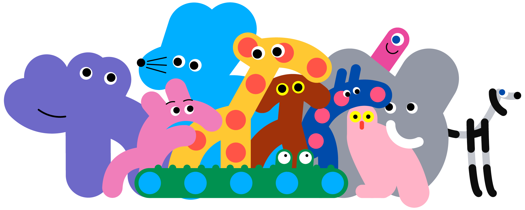 Simple and colorful creatures built from bold, rounded lines.