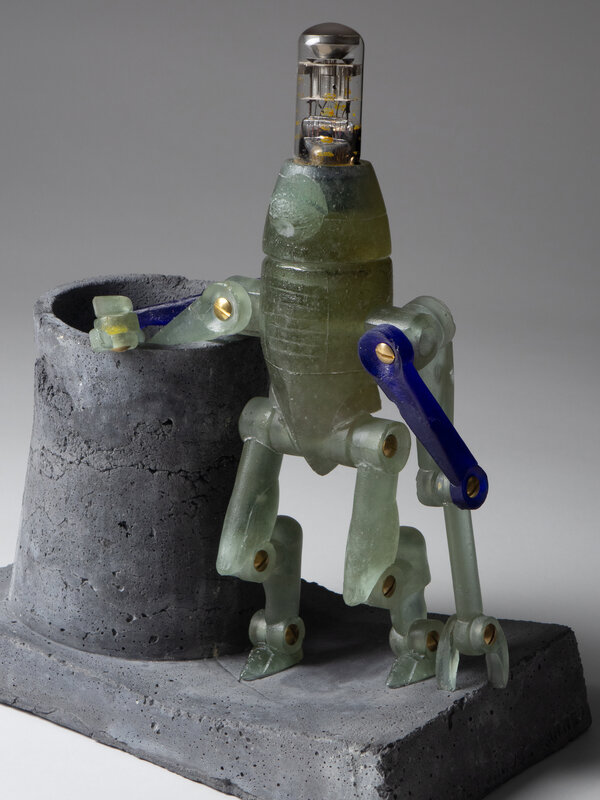 I had two design considerations for this sculpture. The first is the connection with the electricity, which is primarily represented by the electron tube from the old radio placed on top of his head. When designing the limbs, I wanted to give it some kind of insect character. I also chose electricity as a support: a cooling chimney of a power plant serves as a resting point.