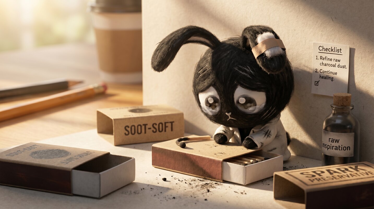 Observation: Healing supplies are gone. With empty "SOOT-SOFT" boxes and a bandaged ear from a recent fall, an exhausted Momo struggles to find the energy to continue.