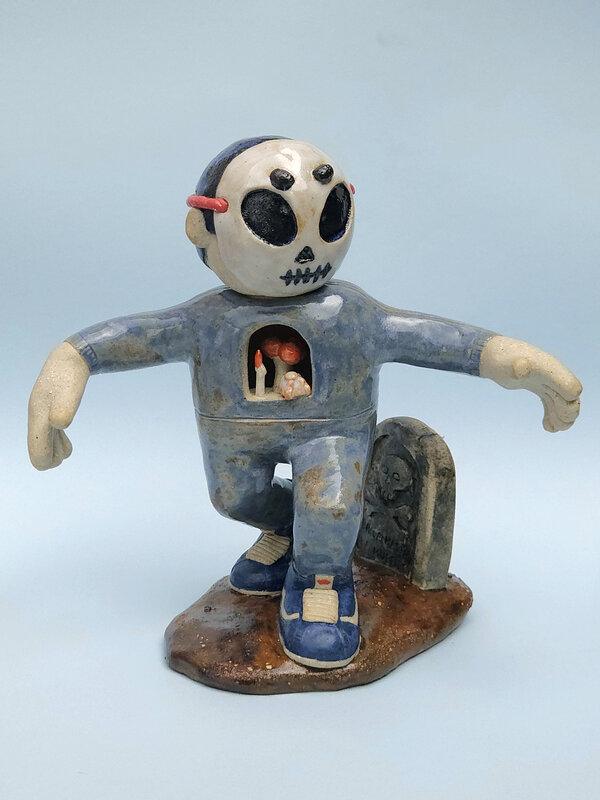 A boy who rises from his grave to celebrate and dance because he is rememberd, with an altar that lights up on his chest to give him life after death